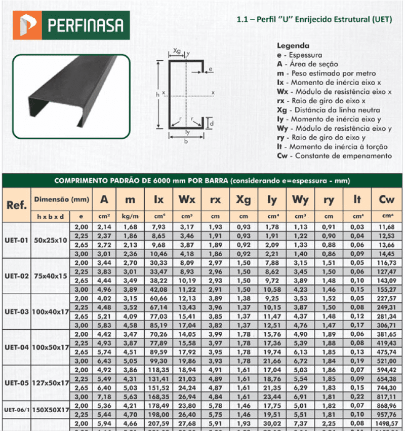 Perfil estrutural ‘’U’’ enrijecido – 2 mm até 12,50 mm, com 3 m ou 6 m de comprimento